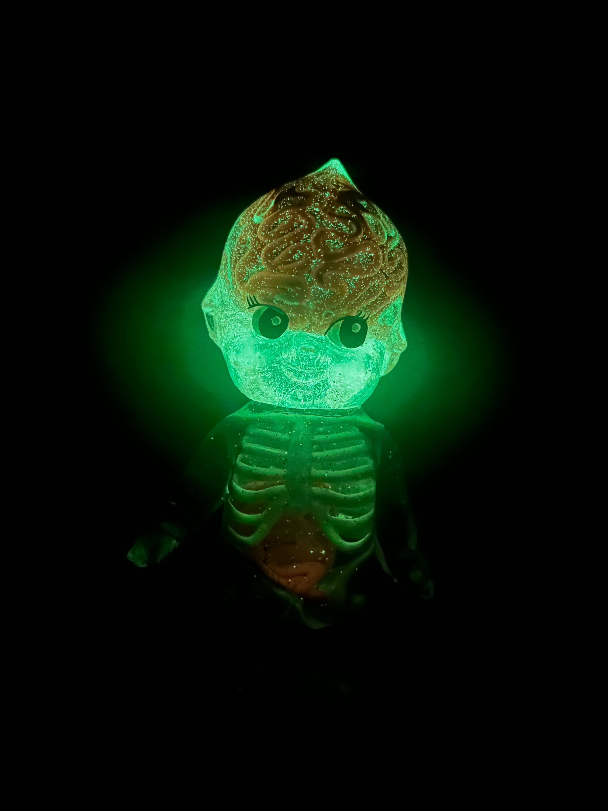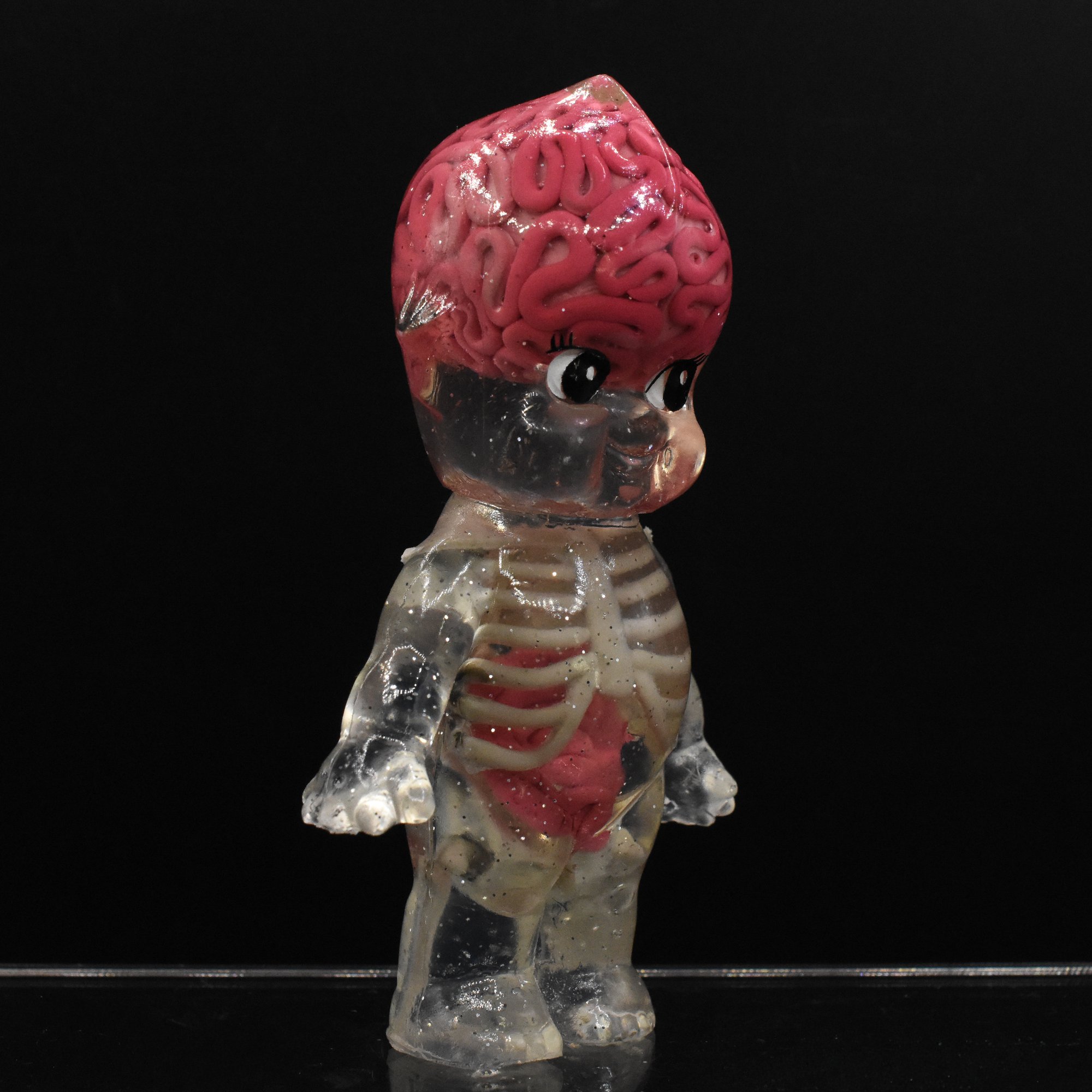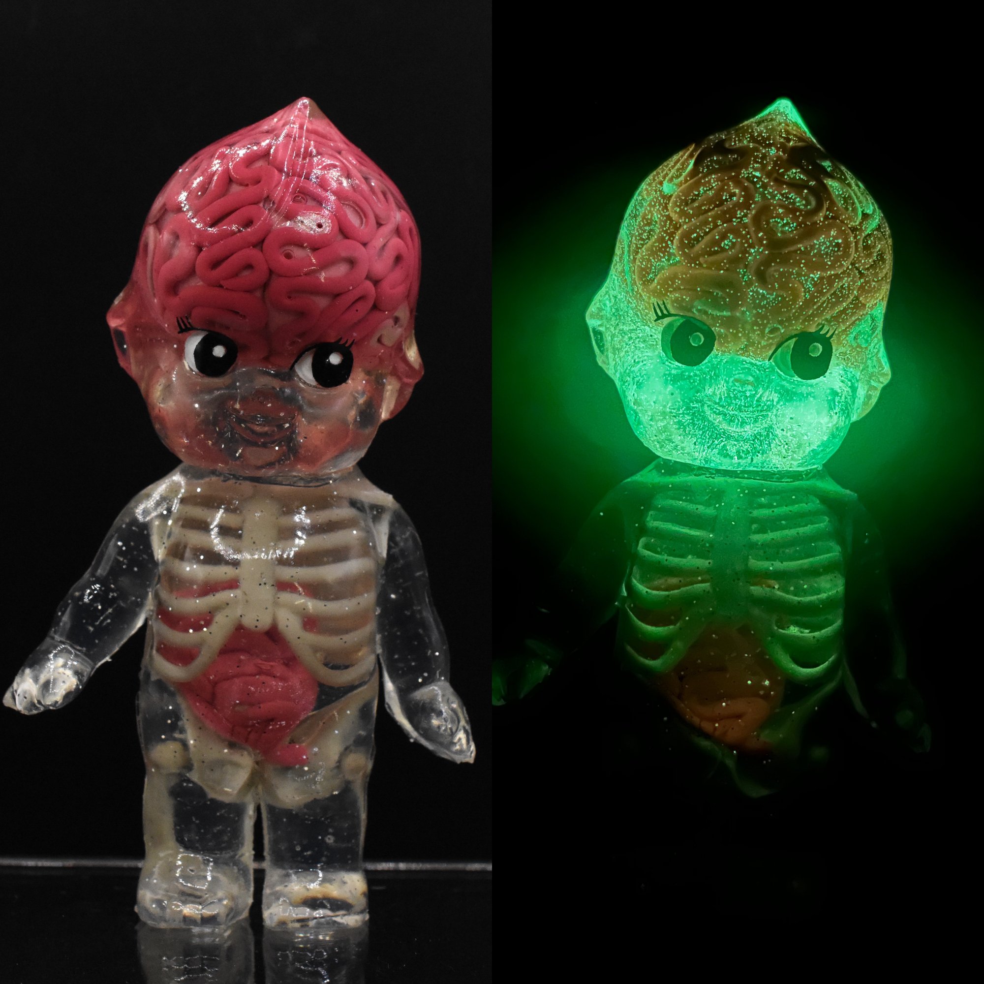 Large Kilos Kewties double casted resin toy with a hand sculpted brain, guts ribcage spine and pelvic bone double cast inside as well as silver glitter thruout the figure. Head of the kewpie glows in the dark!