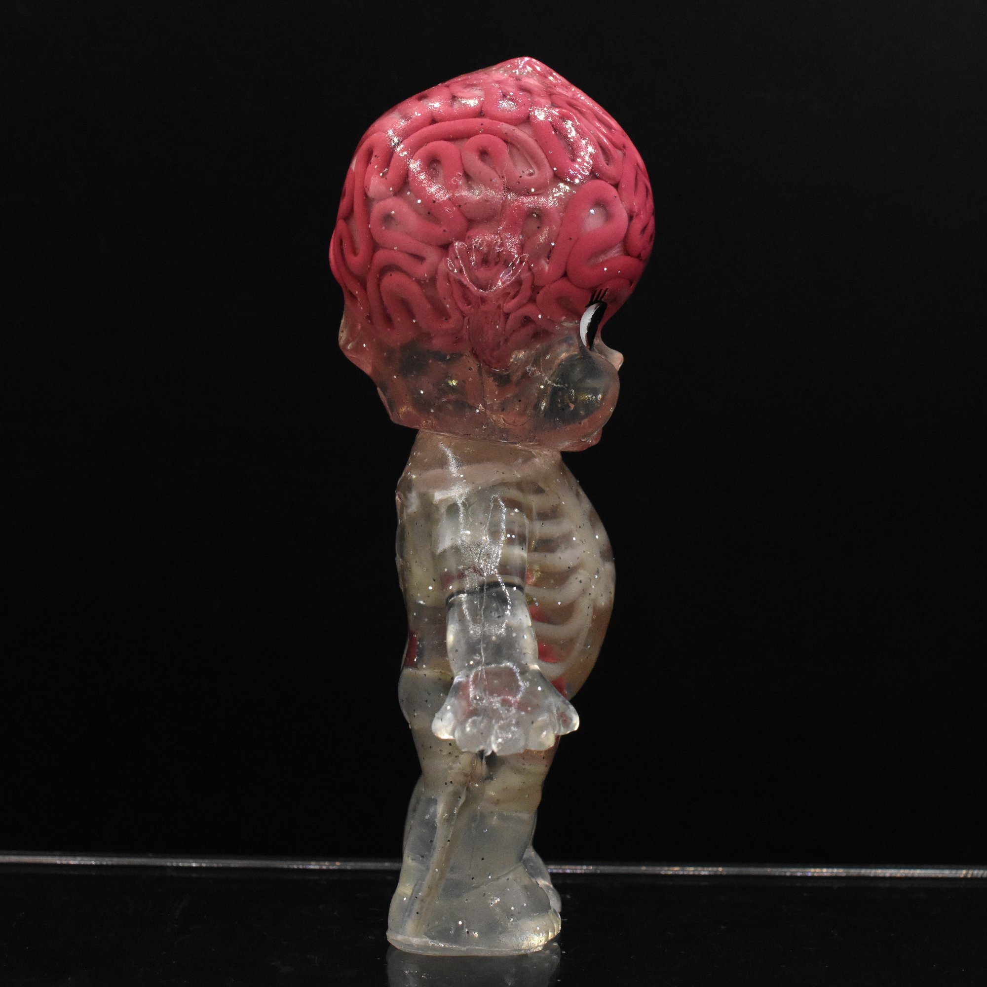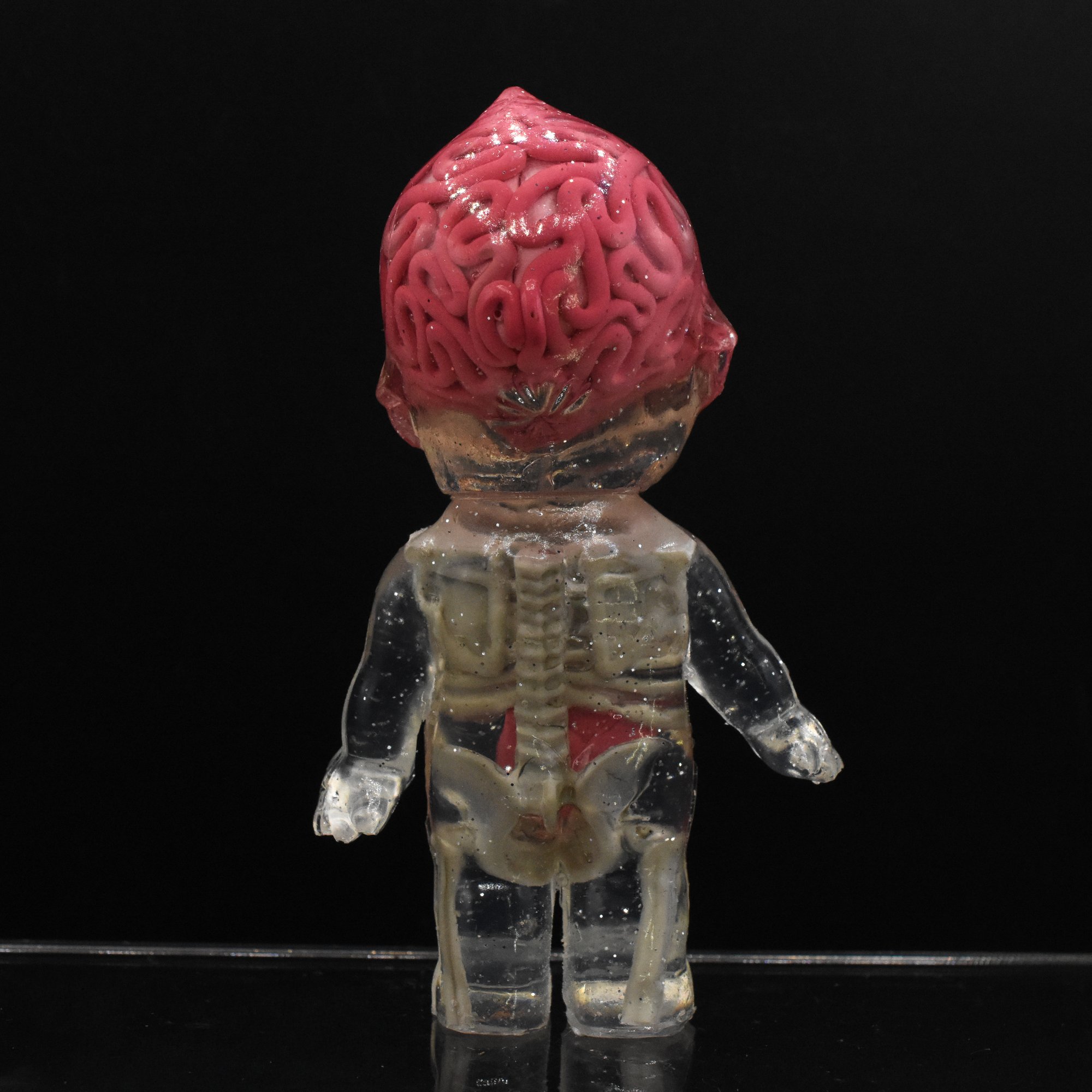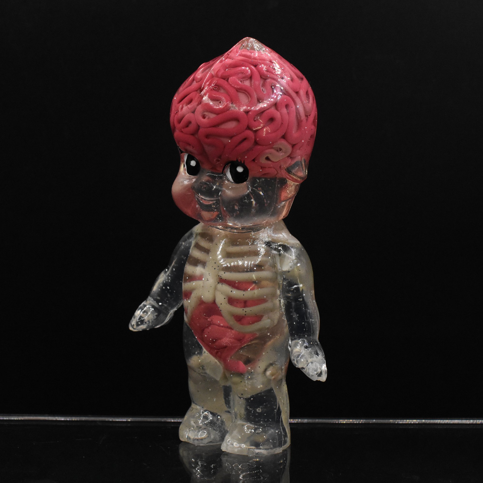 Large Kilos Kewties double casted resin toy with a hand sculpted brain, guts ribcage spine and pelvic bone double cast inside as well as silver glitter thruout the figure. Head of the kewpie glows in the dark!