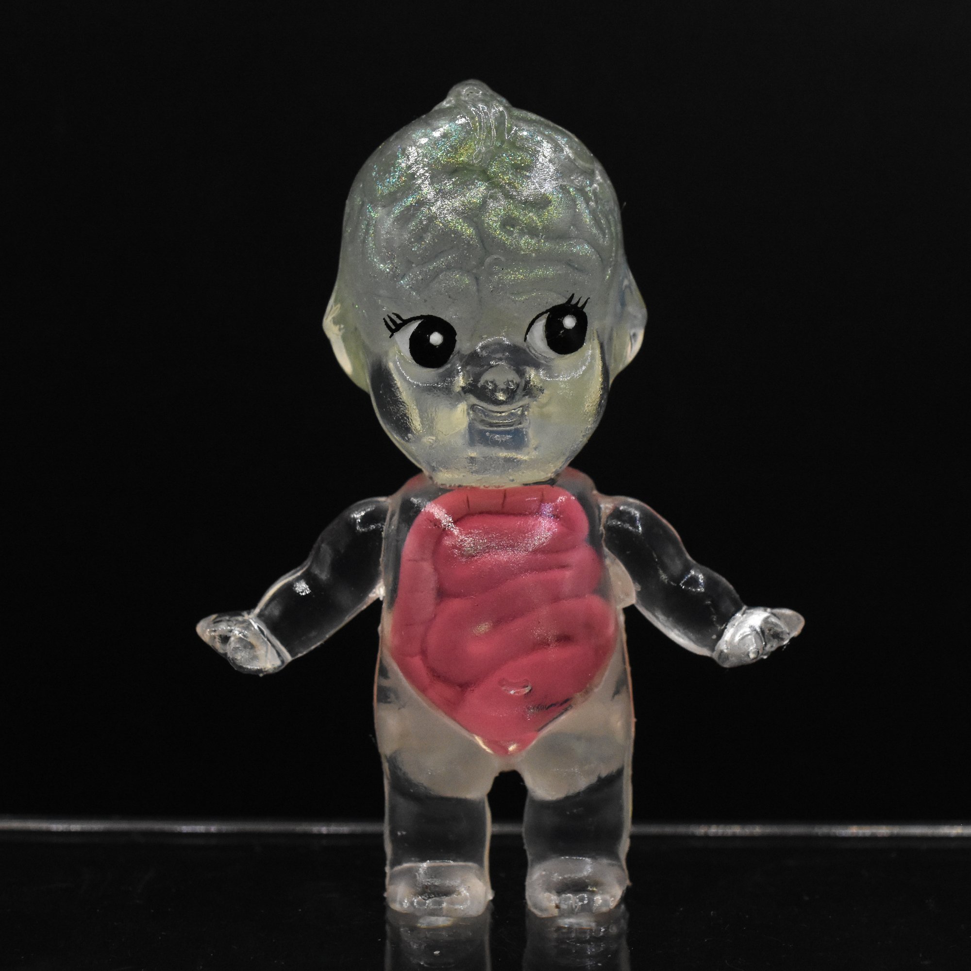 3 inch tall Kilos Kewties double casted resin toy with a shimmery green brain that glows blue in the dark, and a green glow in the dark pelvis and spine qith hand sculpted intestines double cast inside.
