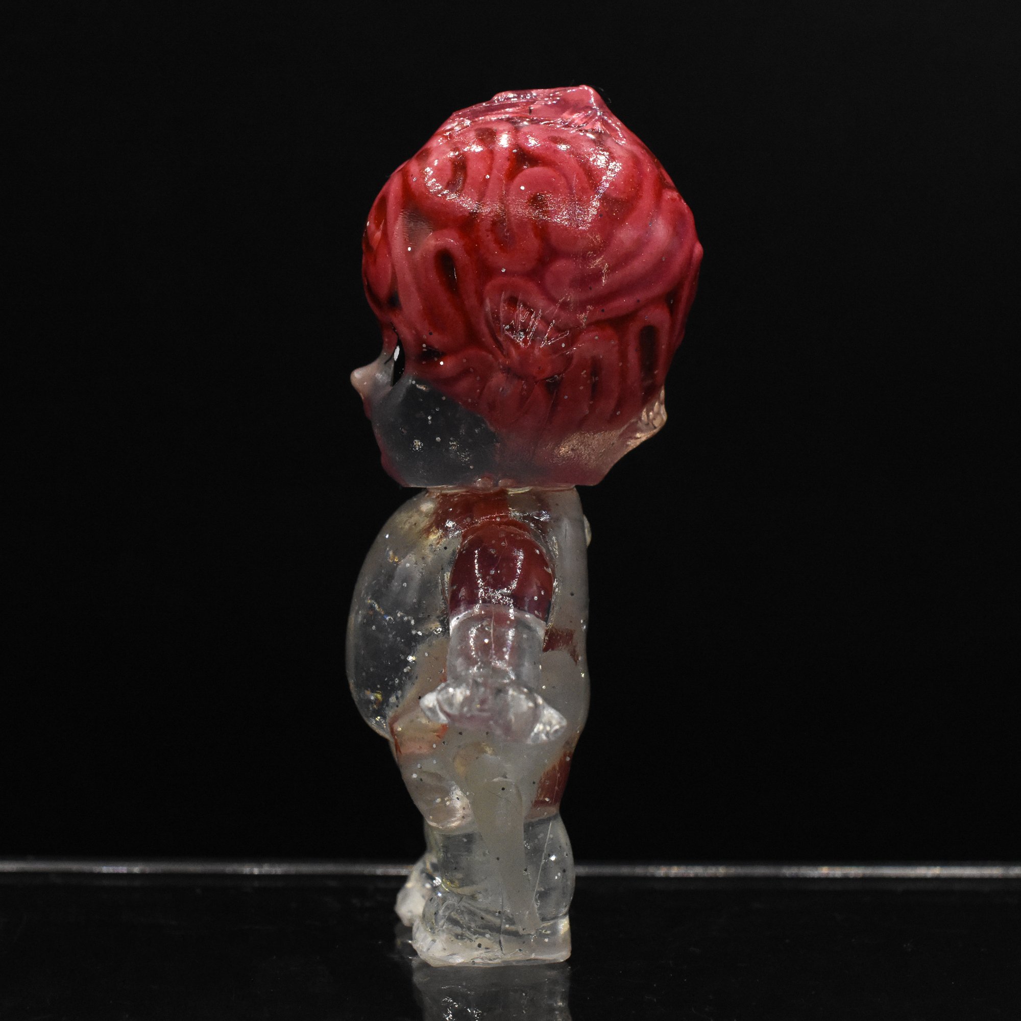3 inch tall Kilos Kewties double casted resin toy with a hand sculpted red brain and intestines, green glow in the dark pelvis and spine double cast inside as well as silver glitter thruout.