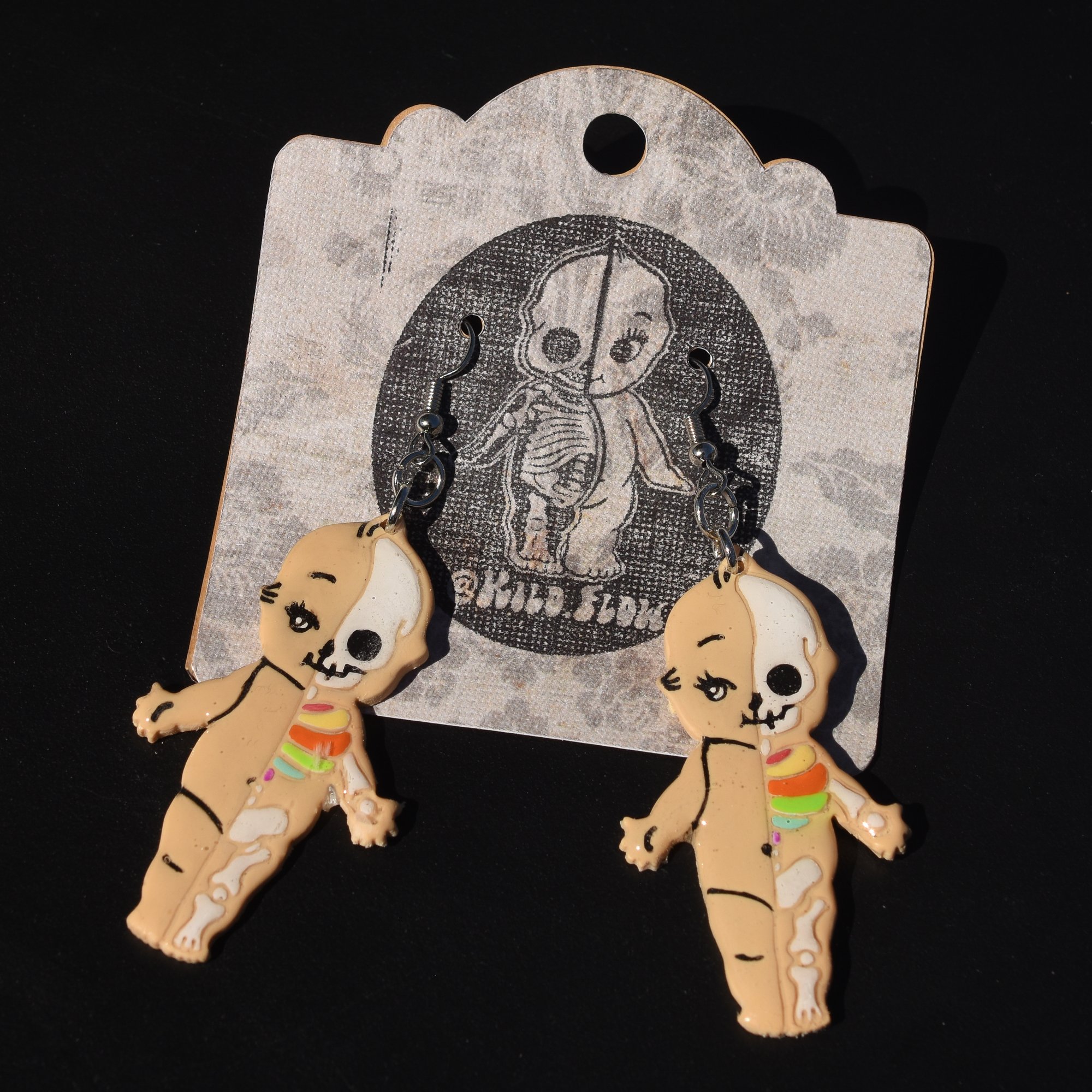Polymer clay fishhook earrings of the classic anatomical kewpie with a rainbow ribcage finished with a layer of protective glossy UV resin. Measures approximately 2 inches with a drop of 3 inches total