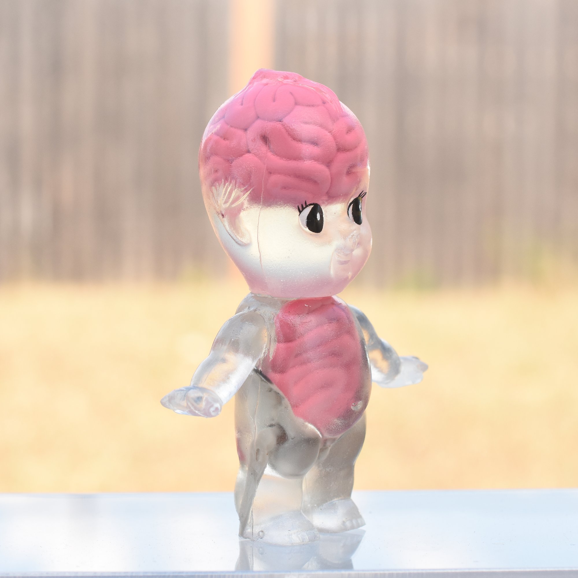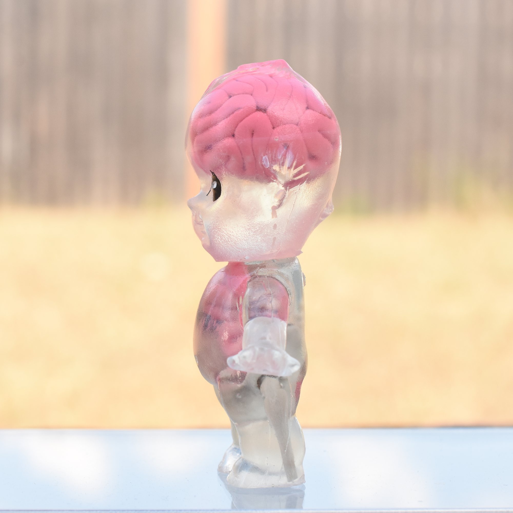 Limit sun exposure as clear resin or any vinyl figure will amber overtime when getting consistent and direct sun exposure as well as potentially reduce glow strength.