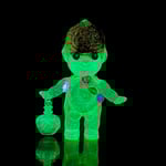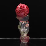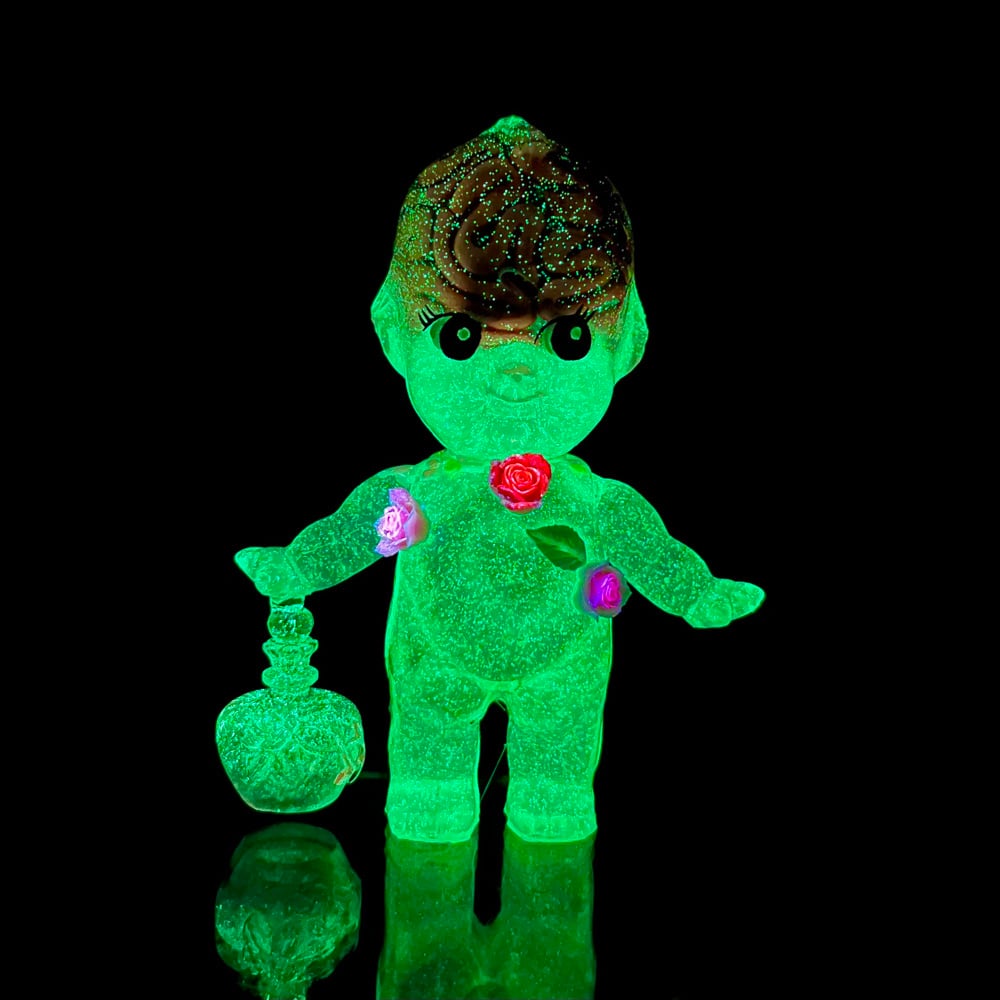 3 inch tall Kilos Kewpie valentines day edition resin toy with a hand sculpted brain, spine and pelvis that glows green in the dark, sprinkles thru out the body of the figure as well as flaming copper and silver heart cast in the belly. Entire figure glows in the dark! Finished glow in the dark roses, a heart charm on attached to the back as well as a red "love potion" bottle that also glows in the dark attached to the hand.