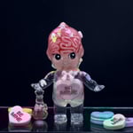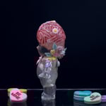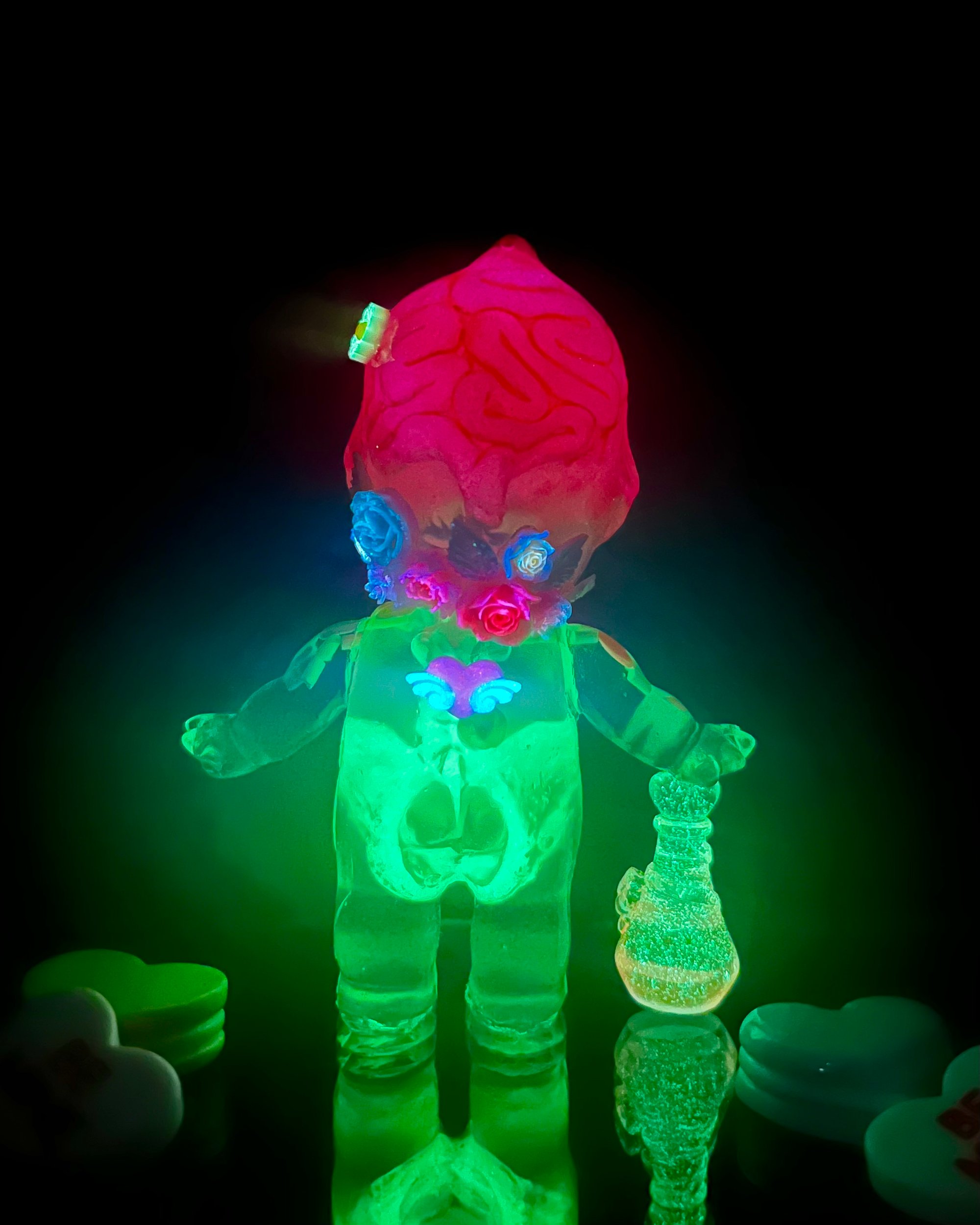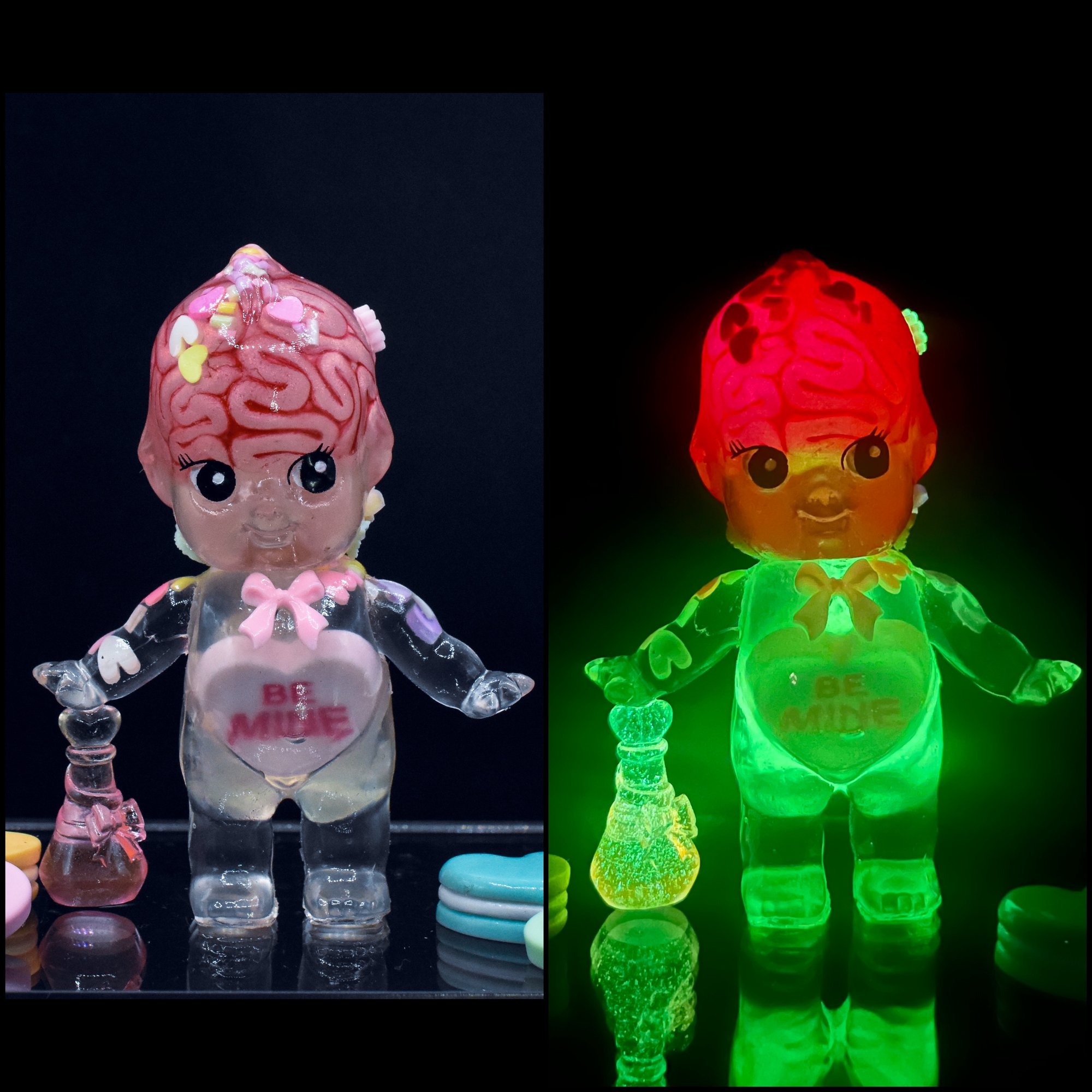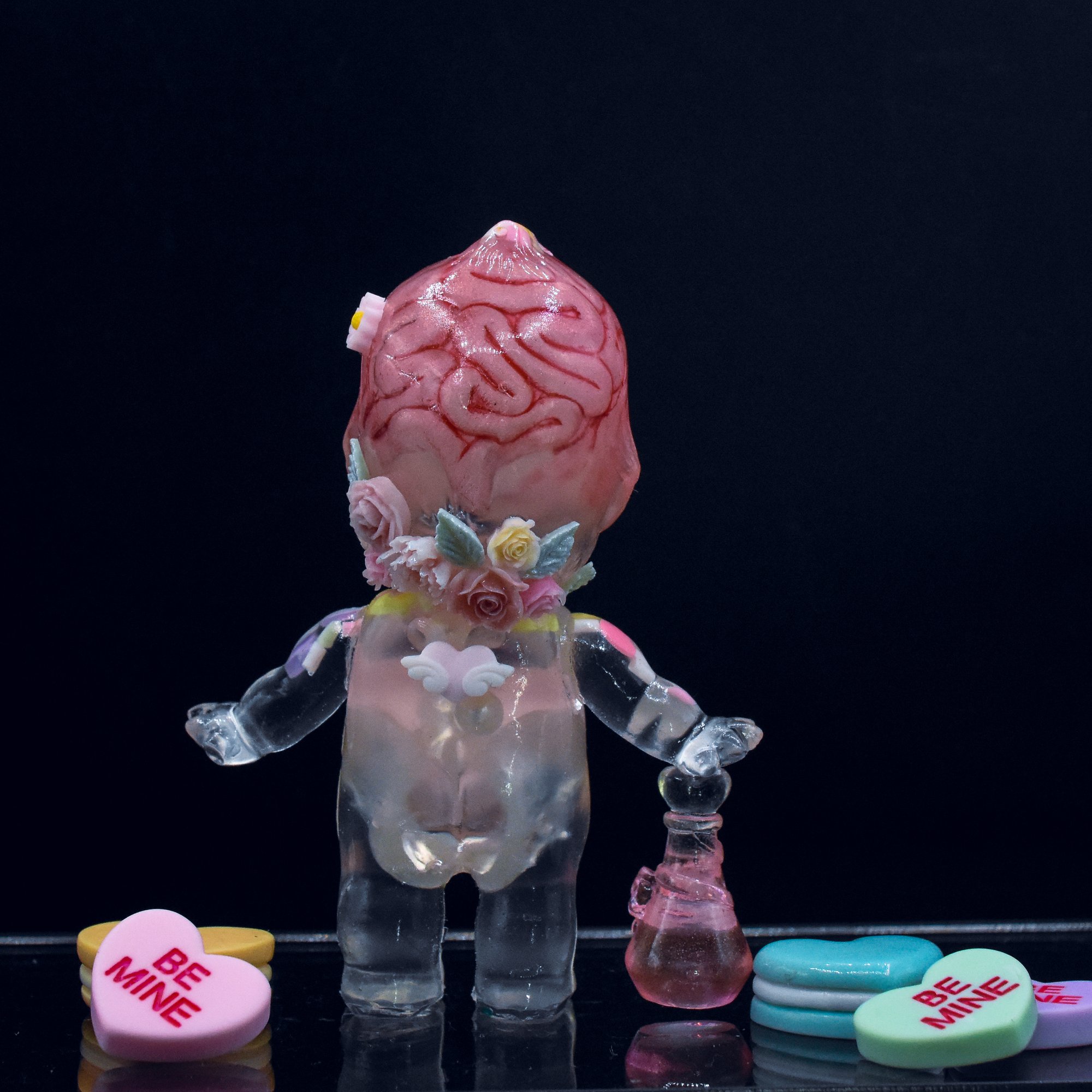 3 inch tall Kilos Kewpie valentines day edition resin toy with a pink brain that glows red in the dark, a double cast spine and pelvis that glows green in the dark, heart and sprinkles thru out the figure as well as a candy heart in the belly. Finished with a pink bow on the chest, glow in the dark roses, flowers and leaves attached to the head, as well as a pink love potion bottle that also glows in the dark attached to the hand. (Extra candy hearts in the main photos are used as props, not included)
